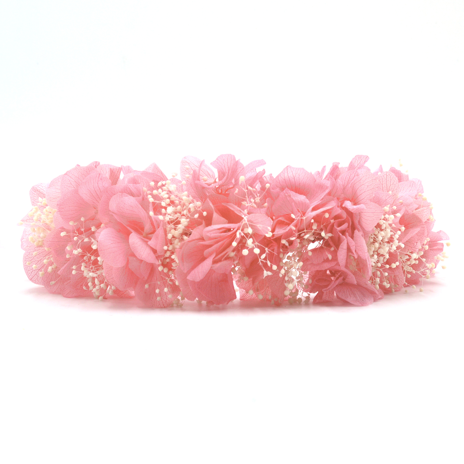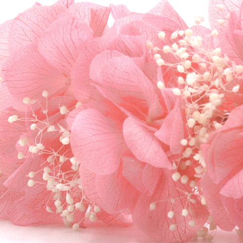 - Composition : fleurs d’hortensia rose stabilisées et gypsophile ivoire stabilisé